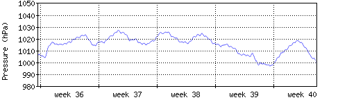Der blaue Graph zeigt den mittleren Luftdruck, der Bereich zwischen grösstem und kleinstem Druck während des Messintervals ist in hellblau dargestellt. |