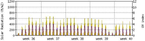Das goldene Histogramm zeigt die totale Sonnestrahlung in W/m^2, die Skala befindet sich am linken Rand. Die violette Kurve zeigt den UV index, mit der Skala am rechten Rand. Man beachte, dass nach Schneefall die Messwerte nicht zuverlässig sind, weil die Sensoren nicht automatisch vom Schnee befreit werden. |