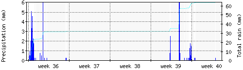 Das blaue Histogram zeigt die totale Niederschlagsmenge (oder deren Wassergehalt) in mm während des Messintervals. |