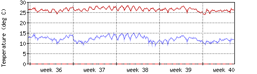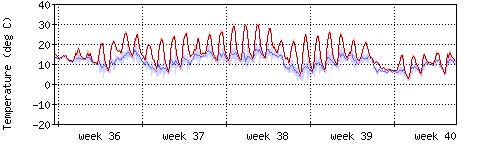 Die rote Kurve zeigt die Innentemperatur,die hellrote Fläche zeigt den Bereichh zwischen höchster und tiefster Temperatur während des Messzeitraums. |