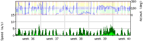 Der untere Teil des Graphen zeigt in hellgrün die mittlere Windgeschwindigkeit, die Spitzengeschwindigkeit ist dunkelgrün dargestellt, die zugehörige Skala findet sich am linken Rand. Der obere Teil des Graphen zeigt das Wind-Azimut in blau, die Skala steht am rechten Rand. |