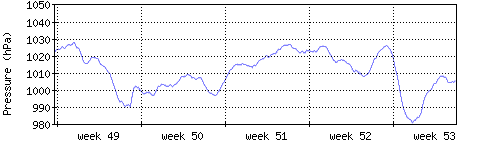 Der blaue Graph zeigt den mittleren Luftdruck, der Bereich zwischen grösstem und kleinstem Druck während des Messintervals ist in hellblau dargestellt. |