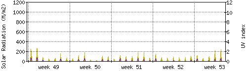 Das goldene Histogramm zeigt die totale Sonnestrahlung in W/m^2, die Skala befindet sich am linken Rand. Die violette Kurve zeigt den UV index, mit der Skala am rechten Rand. Man beachte, dass nach Schneefall die Messwerte nicht zuverlässig sind, weil die Sensoren nicht automatisch vom Schnee befreit werden. |