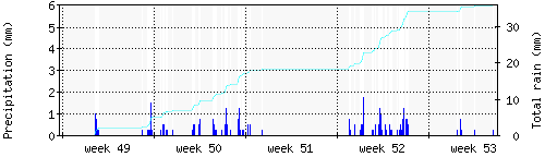 Das blaue Histogram zeigt die totale Niederschlagsmenge (oder deren Wassergehalt) in mm während des Messintervals. |
