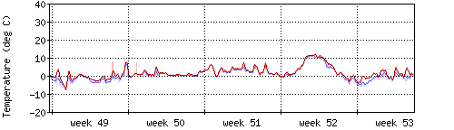 Die rote Kurve zeigt die Temperatur, die hellrote Fläche zeigt den Bereich zwischen höchsten und niedrigsten Temperatur während des Messintervals. Die blaue Kurve zeigt den Taupunkt, also die Temperatur, bei der sich Tau zu bilden beginnt. |