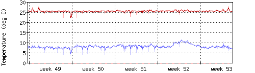 Die rote Kurve zeigt die Innentemperatur,die hellrote Fläche zeigt den Bereichh zwischen höchster und tiefster Temperatur während des Messzeitraums. |