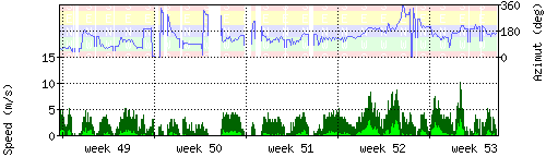 Der untere Teil des Graphen zeigt in hellgrün die mittlere Windgeschwindigkeit, die Spitzengeschwindigkeit ist dunkelgrün dargestellt, die zugehörige Skala findet sich am linken Rand. Der obere Teil des Graphen zeigt das Wind-Azimut in blau, die Skala steht am rechten Rand. |