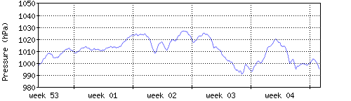 Der blaue Graph zeigt den mittleren Luftdruck, der Bereich zwischen grösstem und kleinstem Druck während des Messintervals ist in hellblau dargestellt. |