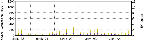 Das goldene Histogramm zeigt die totale Sonnestrahlung in W/m^2, die Skala befindet sich am linken Rand. Die violette Kurve zeigt den UV index, mit der Skala am rechten Rand. Man beachte, dass nach Schneefall die Messwerte nicht zuverlässig sind, weil die Sensoren nicht automatisch vom Schnee befreit werden. |