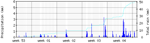 Das blaue Histogram zeigt die totale Niederschlagsmenge (oder deren Wassergehalt) in mm während des Messintervals. |