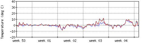 Die rote Kurve zeigt die Temperatur, die hellrote Fläche zeigt den Bereich zwischen höchsten und niedrigsten Temperatur während des Messintervals. Die blaue Kurve zeigt den Taupunkt, also die Temperatur, bei der sich Tau zu bilden beginnt. |