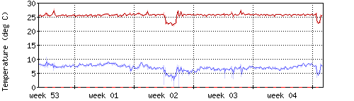 Die rote Kurve zeigt die Innentemperatur,die hellrote Fläche zeigt den Bereichh zwischen höchster und tiefster Temperatur während des Messzeitraums. |