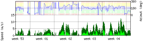 Der untere Teil des Graphen zeigt in hellgrün die mittlere Windgeschwindigkeit, die Spitzengeschwindigkeit ist dunkelgrün dargestellt, die zugehörige Skala findet sich am linken Rand. Der obere Teil des Graphen zeigt das Wind-Azimut in blau, die Skala steht am rechten Rand. |