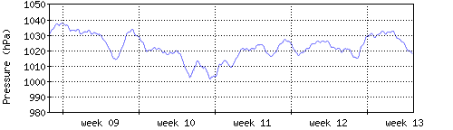 Der blaue Graph zeigt den mittleren Luftdruck, der Bereich zwischen grösstem und kleinstem Druck während des Messintervals ist in hellblau dargestellt. |
