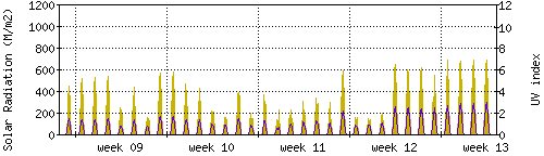 Das goldene Histogramm zeigt die totale Sonnestrahlung in W/m^2, die Skala befindet sich am linken Rand. Die violette Kurve zeigt den UV index, mit der Skala am rechten Rand. Man beachte, dass nach Schneefall die Messwerte nicht zuverlässig sind, weil die Sensoren nicht automatisch vom Schnee befreit werden. |