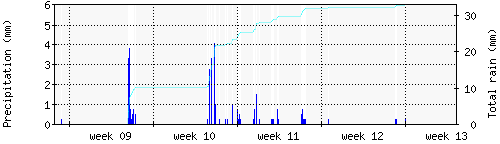 Das blaue Histogram zeigt die totale Niederschlagsmenge (oder deren Wassergehalt) in mm während des Messintervals. |