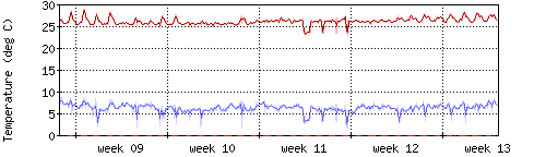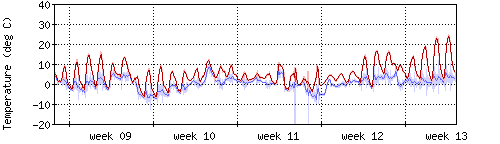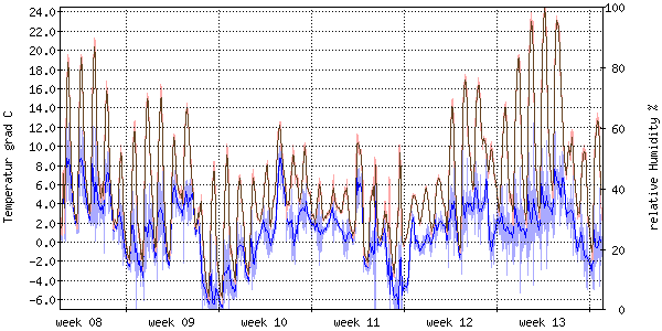 Die rote Kurve zeigt die Temperatur, die hellrote Fläche zeigt den Bereich zwischen höchsten und niedrigsten Temperatur während des Messintervals. Die blaue Kurve zeigt den Taupunkt, also die Temperatur, bei der sich Tau zu bilden beginnt. |