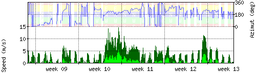 Der untere Teil des Graphen zeigt in hellgrün die mittlere Windgeschwindigkeit, die Spitzengeschwindigkeit ist dunkelgrün dargestellt, die zugehörige Skala findet sich am linken Rand. Der obere Teil des Graphen zeigt das Wind-Azimut in blau, die Skala steht am rechten Rand. |