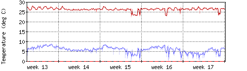 Die rote Kurve zeigt die Innentemperatur,die hellrote Fläche zeigt den Bereichh zwischen höchster und tiefster Temperatur während des Messzeitraums. |