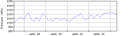 Der blaue Graph zeigt den mittleren Luftdruck, der Bereich zwischen grösstem und kleinstem Druck während des Messintervals ist in hellblau dargestellt. |