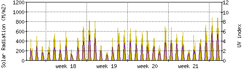Das goldene Histogramm zeigt die totale Sonnestrahlung in W/m^2, die Skala befindet sich am linken Rand. Die violette Kurve zeigt den UV index, mit der Skala am rechten Rand. Man beachte, dass nach Schneefall die Messwerte nicht zuverlässig sind, weil die Sensoren nicht automatisch vom Schnee befreit werden. |