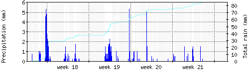 Das blaue Histogram zeigt die totale Niederschlagsmenge (oder deren Wassergehalt) in mm während des Messintervals. |