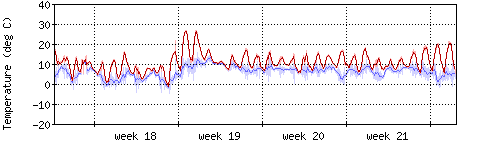 Die rote Kurve zeigt die Temperatur, die hellrote Fläche zeigt den Bereich zwischen höchsten und niedrigsten Temperatur während des Messintervals. Die blaue Kurve zeigt den Taupunkt, also die Temperatur, bei der sich Tau zu bilden beginnt. |