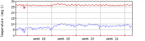 Die rote Kurve zeigt die Innentemperatur,die hellrote Fläche zeigt den Bereichh zwischen höchster und tiefster Temperatur während des Messzeitraums. |