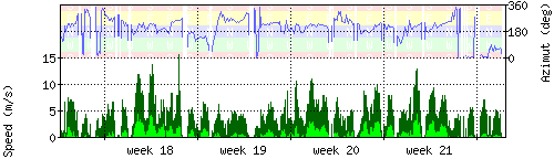 Der untere Teil des Graphen zeigt in hellgrün die mittlere Windgeschwindigkeit, die Spitzengeschwindigkeit ist dunkelgrün dargestellt, die zugehörige Skala findet sich am linken Rand. Der obere Teil des Graphen zeigt das Wind-Azimut in blau, die Skala steht am rechten Rand. |