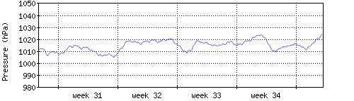 Der blaue Graph zeigt den mittleren Luftdruck, der Bereich zwischen grösstem und kleinstem Druck während des Messintervals ist in hellblau dargestellt. |