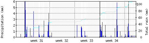 Das blaue Histogram zeigt die totale Niederschlagsmenge (oder deren Wassergehalt) in mm während des Messintervals. |