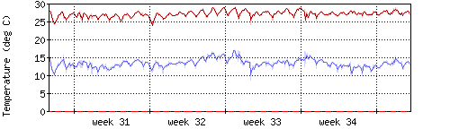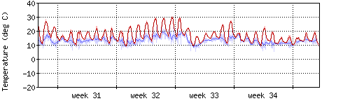 Die rote Kurve zeigt die Innentemperatur,die hellrote Fläche zeigt den Bereichh zwischen höchster und tiefster Temperatur während des Messzeitraums. |