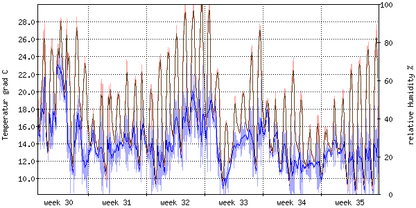 Die rote Kurve zeigt die Temperatur, die hellrote Fläche zeigt den Bereich zwischen höchsten und niedrigsten Temperatur während des Messintervals. Die blaue Kurve zeigt den Taupunkt, also die Temperatur, bei der sich Tau zu bilden beginnt. |