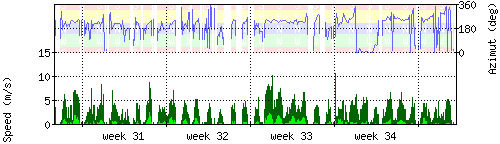 Der untere Teil des Graphen zeigt in hellgrün die mittlere Windgeschwindigkeit, die Spitzengeschwindigkeit ist dunkelgrün dargestellt, die zugehörige Skala findet sich am linken Rand. Der obere Teil des Graphen zeigt das Wind-Azimut in blau, die Skala steht am rechten Rand. |