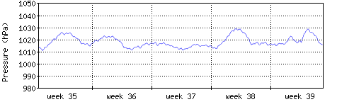Der blaue Graph zeigt den mittleren Luftdruck, der Bereich zwischen grösstem und kleinstem Druck während des Messintervals ist in hellblau dargestellt. |