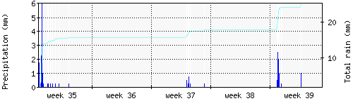 Das blaue Histogram zeigt die totale Niederschlagsmenge (oder deren Wassergehalt) in mm während des Messintervals. |