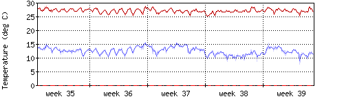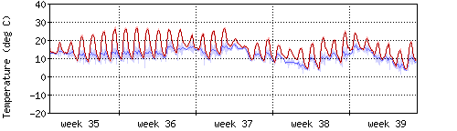 Die rote Kurve zeigt die Innentemperatur,die hellrote Fläche zeigt den Bereichh zwischen höchster und tiefster Temperatur während des Messzeitraums. |