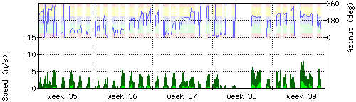 Der untere Teil des Graphen zeigt in hellgrün die mittlere Windgeschwindigkeit, die Spitzengeschwindigkeit ist dunkelgrün dargestellt, die zugehörige Skala findet sich am linken Rand. Der obere Teil des Graphen zeigt das Wind-Azimut in blau, die Skala steht am rechten Rand. |