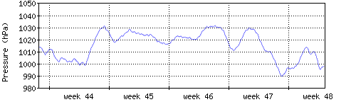 Der blaue Graph zeigt den mittleren Luftdruck, der Bereich zwischen grösstem und kleinstem Druck während des Messintervals ist in hellblau dargestellt. |