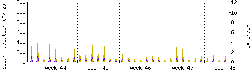 Das goldene Histogramm zeigt die totale Sonnestrahlung in W/m^2, die Skala befindet sich am linken Rand. Die violette Kurve zeigt den UV index, mit der Skala am rechten Rand. Man beachte, dass nach Schneefall die Messwerte nicht zuverlässig sind, weil die Sensoren nicht automatisch vom Schnee befreit werden. |