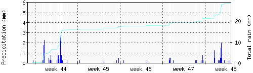Das blaue Histogram zeigt die totale Niederschlagsmenge (oder deren Wassergehalt) in mm während des Messintervals. |