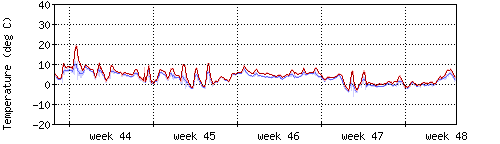 Die rote Kurve zeigt die Temperatur, die hellrote Fläche zeigt den Bereich zwischen höchsten und niedrigsten Temperatur während des Messintervals. Die blaue Kurve zeigt den Taupunkt, also die Temperatur, bei der sich Tau zu bilden beginnt. |