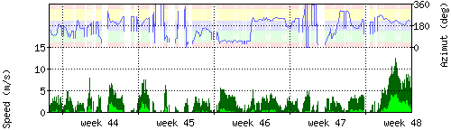 Der untere Teil des Graphen zeigt in hellgrün die mittlere Windgeschwindigkeit, die Spitzengeschwindigkeit ist dunkelgrün dargestellt, die zugehörige Skala findet sich am linken Rand. Der obere Teil des Graphen zeigt das Wind-Azimut in blau, die Skala steht am rechten Rand. |