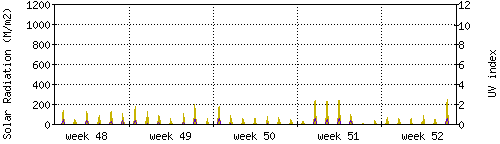 Das goldene Histogramm zeigt die totale Sonnestrahlung in W/m^2, die Skala befindet sich am linken Rand. Die violette Kurve zeigt den UV index, mit der Skala am rechten Rand. Man beachte, dass nach Schneefall die Messwerte nicht zuverlässig sind, weil die Sensoren nicht automatisch vom Schnee befreit werden. |