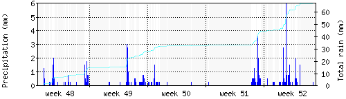 Das blaue Histogram zeigt die totale Niederschlagsmenge (oder deren Wassergehalt) in mm während des Messintervals. |