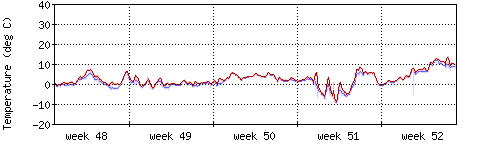 Die rote Kurve zeigt die Temperatur, die hellrote Fläche zeigt den Bereich zwischen höchsten und niedrigsten Temperatur während des Messintervals. Die blaue Kurve zeigt den Taupunkt, also die Temperatur, bei der sich Tau zu bilden beginnt. |