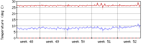 Die rote Kurve zeigt die Innentemperatur,die hellrote Fläche zeigt den Bereichh zwischen höchster und tiefster Temperatur während des Messzeitraums. |
