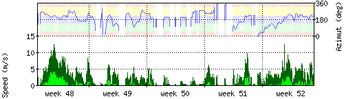 Der untere Teil des Graphen zeigt in hellgrün die mittlere Windgeschwindigkeit, die Spitzengeschwindigkeit ist dunkelgrün dargestellt, die zugehörige Skala findet sich am linken Rand. Der obere Teil des Graphen zeigt das Wind-Azimut in blau, die Skala steht am rechten Rand. |