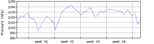Der blaue Graph zeigt den mittleren Luftdruck, der Bereich zwischen grösstem und kleinstem Druck während des Messintervals ist in hellblau dargestellt. |