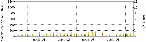 Das goldene Histogramm zeigt die totale Sonnestrahlung in W/m^2, die Skala befindet sich am linken Rand. Die violette Kurve zeigt den UV index, mit der Skala am rechten Rand. Man beachte, dass nach Schneefall die Messwerte nicht zuverlässig sind, weil die Sensoren nicht automatisch vom Schnee befreit werden. |